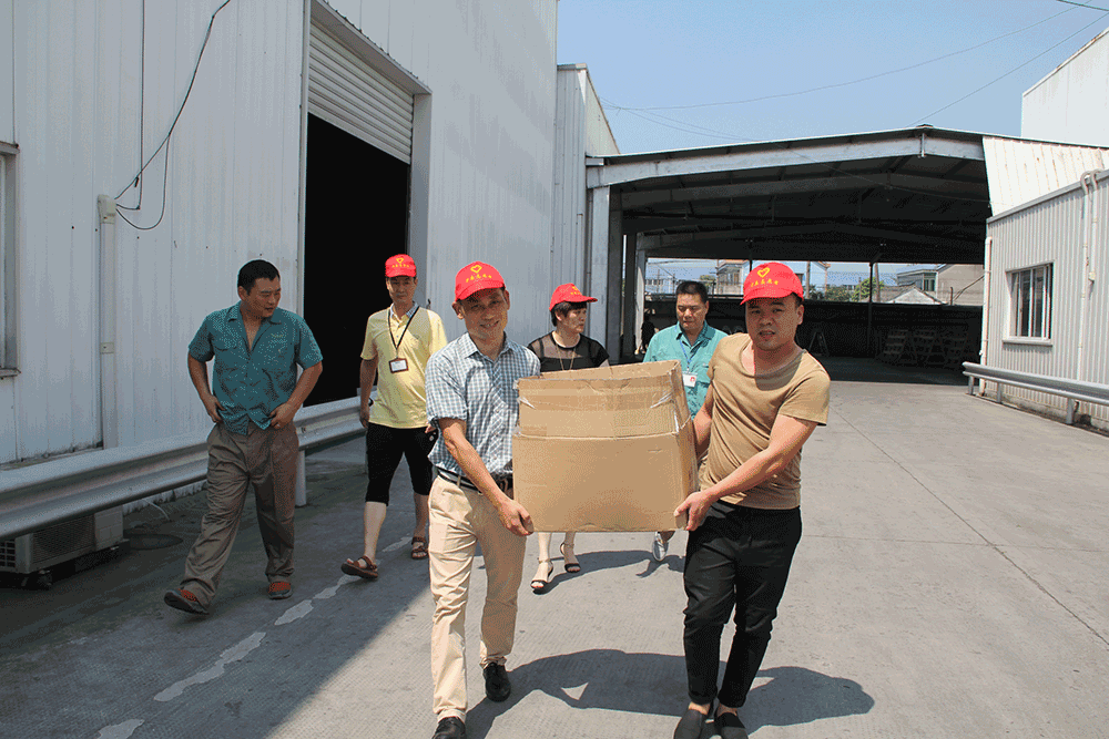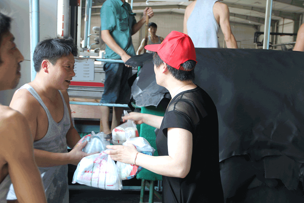 上午10時許,志愿者們兵分三路,帶著豆奶、毛巾、洗衣粉等用品,前往森德公司、海寧卡森公司和家值公司的繃板車間和真空車間,為一線忙碌的工人們送上了清涼用品,與他們親切握手,對高溫天氣中依然堅守崗位的一線員工表示感謝,感謝他們不辭炎熱和勞累,為公司生產(chǎn)積極奉獻。同時關切地要求他們注意身體健康和勞動安全,做好防暑降溫工作。