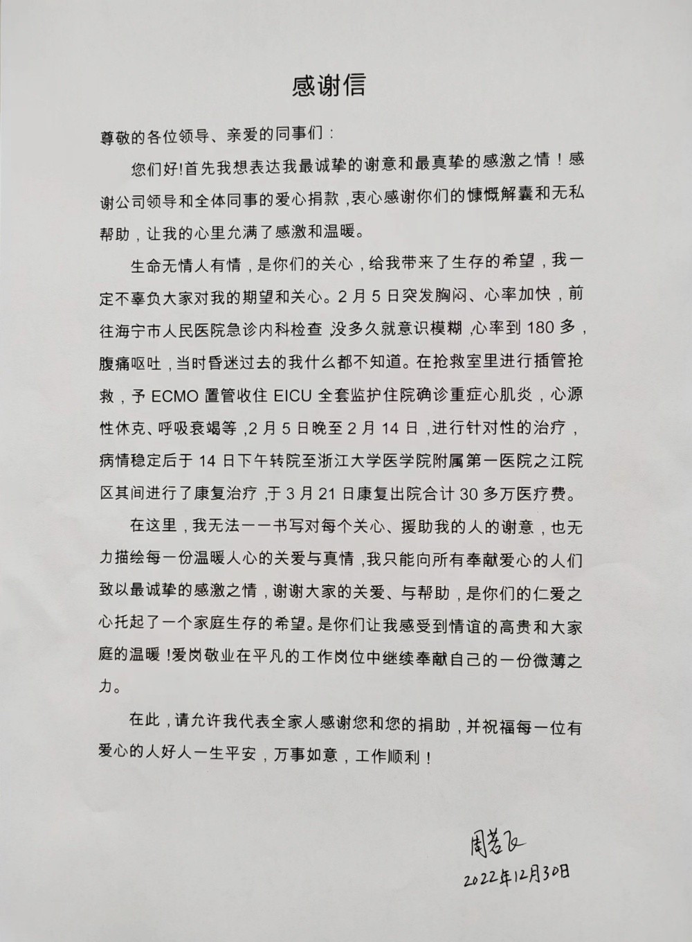 今年年初,周若飛突發(fā)重癥心肌炎,經(jīng)過一個多月的搶救和手術(shù)治療,最終挺過難關(guān),但花費(fèi)了一筆很大的醫(yī)療費(fèi)用,自費(fèi)費(fèi)用近20萬元,給家庭造成了較大的經(jīng)濟(jì)壓力。為此,集團(tuán)員工關(guān)愛互助基金解員工之憂,按基金會章程規(guī)定,給予了周若飛頂級的醫(yī)療救助金。