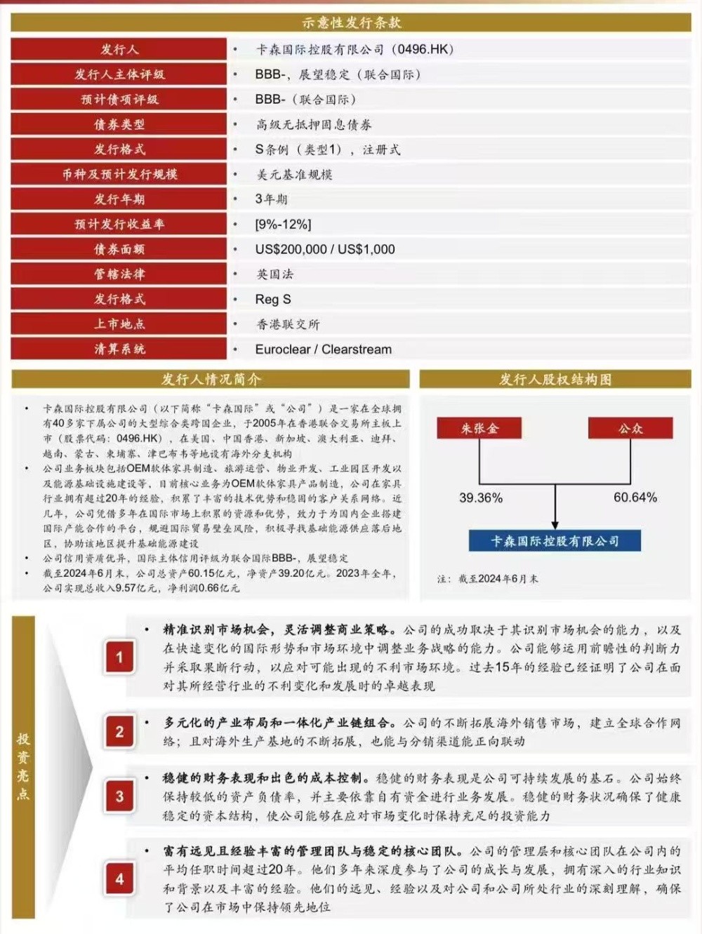 卡森國際(00496.HK)在港股上市二十余年,公司資產(chǎn)質(zhì)量良好,運營穩(wěn)健,負債率低,存量資產(chǎn)優(yōu)質(zhì),目前正在進行的投資項目(柬埔寨浙江經(jīng)濟特區(qū)項目、蒙古國火電項目、津巴布韋火電項目),未來三至五年回報較高,且償債能力強!作為近年來為數(shù)不多的發(fā)改委批復額度的非地產(chǎn)民企高收益美元債,具體收益率及發(fā)行條件可談!歡迎感興趣的朋友和袁志剛聯(lián)系!