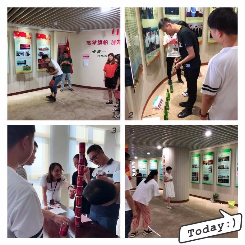 企鵝漫步其實是要求游戲者腋下夾兩個球,雙腿間再夾一個球,越過障礙走一個來回??矗覀冃£懲瑢W(xué)像不像一只企鵝。易拉罐積木是一正一反依次往上疊,果然高手在民間,瞧,我們葛經(jīng)理竟疊起了8個,直叫人拍手叫好。其他項目也是一片熱鬧景象,現(xiàn)場一片歡聲笑語。