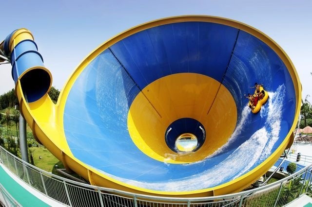 · 超級大喇叭,受歡迎的大型水上設(shè)備之一。坐在特別設(shè)計的四葉草型浮圈里面滑行,從16米高空滑行到直徑約21米的巨大的喇叭型圓錐體里面,像是被龍卷風(fēng)吸進(jìn)去的感覺。