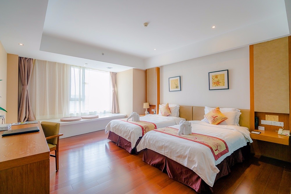 酒店有豪華溫泉大床房、豪華溫泉標準間、棋牌大床房、特色四人房等房型,特色是每間客房的平均面積有42平方米,有景觀飄窗、大浴缸、24小時熱水、干濕分離的衛(wèi)生間、WIFI全域覆蓋……硬件設(shè)施配套人性化。酒店的部分客房做成了童話藍的夢幻風,夏天的時候特別受親子家庭的喜歡。